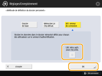 3 | Sélectionnez les informations d'authentification à utiliser et appuyez sur <OK>. Pour utiliser un nom d'utilisateur et mot de passe séparés pour le dossier personnel , appuyez sur <Util. infos auth. pour chq utilis.> pour ajouter une case. Retirez la case pour utiliser le même nom d'utilisateur et le même mot de passe que ceux saisis lors de la connexion. Si une case est ajoutée à cet élément, un nom d'utilisateur et un mot de passe doivent être enregistrés pour chaque utilisateur. ![]() Un dossier est créé dans un dossier de base avec les noms suivants. Si une coche est ajoutée à <Util. infos auth. pour chq utilis.> : nom d'utilisateur spécifié par un utilisateur Si aucune coche n'est ajoutée à <Util. infos auth. pour chq utilis.> : nom d'utilisateur utilisé pour la connexion |