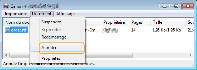 Si vous ne trouvez pas le document à annuler, c'est qu'il a déjà été envoyé à l'appareil. Dans un tel cas, vous ne pouvez pas annuler l'impression depuis l'ordinateur.