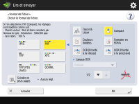 Vous ne pouvez pas sélectionner <OOXML> si vous envoyez un fichier stocké dans <Boîte mémoire RX> de <Boîte Fax/I-Fax>. |