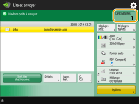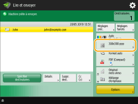 Détermination du haut et du bas de l'originalVous pouvez définir l'orientation du document avant sa numérisation de manière à ce que ses parties haute et basse soient correctement positionnées lors de l'affichage du fichier envoyé/enregistré sur un ordinateur. Si vous chargez un original au format de papier suivant, appuyez sur <Options> sur l'écran des fonctions de base de numérisation <Orientation contenu orig.> <Haut contre bord arrière> <OK>.machines de 208 V et de 120 V : LTR machine de 230 V : A4 Lorsque vous chargez un original au format de papier suivant, appuyez sur <Options> sur l'écran des fonctions de base pour la numérisation <Orientation contenu orig.> sélectionnez <Haut contre bord arrière> ou <Haut contre bord latéral> en fonction de l'orientation de l'original appuyez sur <OK>.machines de 208 V et de 120 V : originaux de grand format comme des documents au format LGL machine de 230 V : originaux de grand format comme des documents au format A3 Spécifier de multiples destinataires y compris de faxEn définissant <Activer Fax dans fonction Lire et Envoyer> sur <Oui> vous pouvez spécifier des destinataires de fax depuis l'écran Fonctions de base de numérisation (<Afficher fonction Fax>). Ce paramètre est utile pour spécifier de multiples destinataires dont des fax, par exemple quand vous sauvegardez une copie d'un fax envoyé dans un serveur de fichier. Vérifier les images scannées avant de les envoyer/sauvegarderVous pouvez vérifier les images scannées dans l'écran d'aperçu avant l'envoi/sauvegarde. Vérifier les originaux scannés avant de les envoyer/sauvegarder (prévisualisation) Enregistrement des paramétrages fréquemment utilisésVous pouvez combiner des destinataires et des réglages de numérisation fréquemment utilisés dans un bouton de l'appareil pour une utilisation ultérieure. Pour faire rapidement vos réglages, il vous suffit d'appuyer sur le bouton enregistré lorsque vous numérisez des originaux. Enregistrement d'une combinaison pour les fonctions fréquemment utilisées |