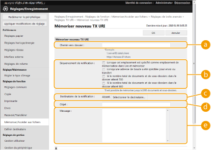 [Lorsque cet emplacement est spécifié comme emplacement de mémorisation dans Lire et mémoriser] | Une notification est envoyée chaque fois qu'un fichier est enregistré dans le dossier spécifié à l'intérieur de l'Boîte avancée depuis <Lire et mémoriser> sur l'afficheur tactile. Toutefois, une notification n'est pas envoyée lorsqu'un fichier est enregistré dans un sous-dossier ou qu'un dossier est ajouté à un sous-dossier. |