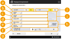 2 | Spécifiez chaque option. ![]() <Méthode Auth. POP>Configurez les méthodes d'authentification du serveur POP3. Pour crypter le mot de passe pendant l'authentification, sélectionnez <APOP>. Pour authentifier les utilisateurs lors de la réception d'e-mails (POP), sélectionnez <AUTH POP>. <Authentif. POP avant l'envoi>Pour appliquer l'authentification à l'aide du serveur POP3, appuyez sur <Oui>. <Autoriser TLS (POP)>Pour crypter les communications vers/depuis le serveur POP3 avec le protocole TLS, appuyez sur <Oui>. Si vous sélectionnez <Oui>, vous pouvez vérifier le certificat du serveur TLS pendant la communication avec le serveur et ajouter un nom commun (CN) aux éléments de vérification. <Réglages E-mail/I-Fax> <Confirmer certificat TLS pour RX POP> |