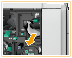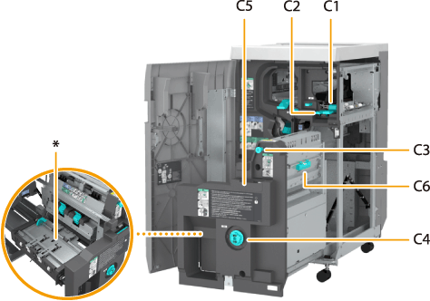Vérifiez si du papier est coincé dans le capot droit de l'ensemble d'agrafage avec piqûre à cheval (C6).