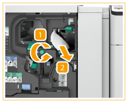 Poussez l'ensemble d'agrafage avec piqûre à cheval (C5) et fermez la porte avant de l'unité de finition.