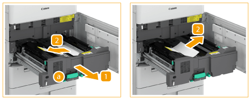 | Empoignez le levier vert (  ) et extrayez l'unité de transport de fixation. | L'unité de fixation et la zone environnante sont soumises à des températures élevées. Lorsque vous retirez du papier coincé, veillez à ne rien toucher dans cette zone. |