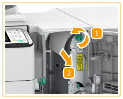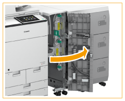 ![]() | Appuyez sur le bouton d'ouverture et ouvrez le magasin à papier. ![]() Si vous n'éliminez pas d'abord le bourrage papier à l'intérieur du capot avant, vous ne pourrez peut-être pas ouvrir le magasin à papier, même en appuyant sur le bouton d'ouverture. Si la machine est en mode veille, vous ne pourrez peut-être pas ouvrir le magasin à papier. Dans ce cas, annulez le mode veille avant d'ouvrir le magasin. |