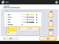 完成調整後,您最多可註冊四個設定。調整色彩後,按下 <叫回/註冊> 從 <C1> 至 <C4> 選擇按鈕 按下 <註冊> <是> <確定>。