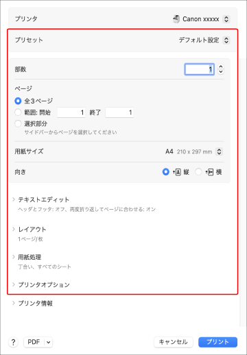 [プリント]ダイアログで、[プリンタ]ポップアップメニューから使用するデバイスを選択