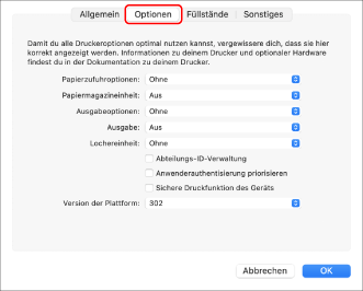 HINWEISWählen Sie nur die Optionen, die gegenwärtig am Gerät installiert sind.