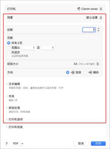 在 [打印] 对话框中,从 [打印机] 弹出式菜单中选择要使用的设备。