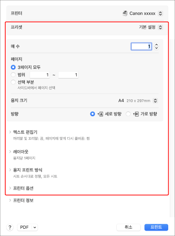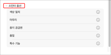 참고사용 중인 응용 프로그램에 따라 [프린터 기능]이 [프린터 옵션]에 표시될 수 있습니다. 이 경우 [프린터 기능]을 클릭한 다음, [기능 세트] 팝업 메뉴에서 설정할 기능을 선택합니다.
