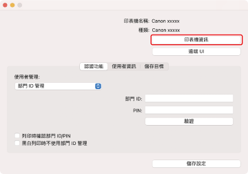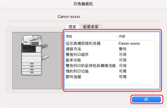 註釋如果顯示在 [印表機資訊] 對話框頂端的驅動程式名稱和 [設定] > [從印表機取得的名稱] 中顯示的名稱不符,則不能使用裝置的功能。如果發生這種情況,請刪除 macOS 的 [系統設定] 中的裝置,然後重新登錄裝置。