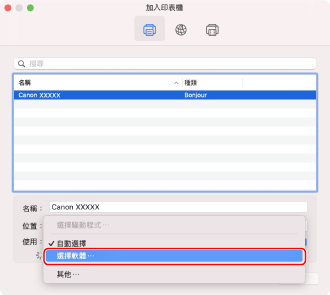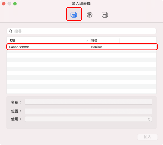 在 [種類] 中選擇顯示為「Bonjour」的印表機。