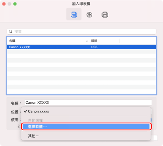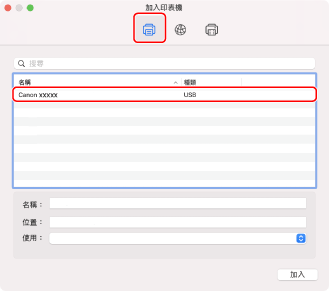 在 [種類] 中選擇顯示為「USB」的印表機。