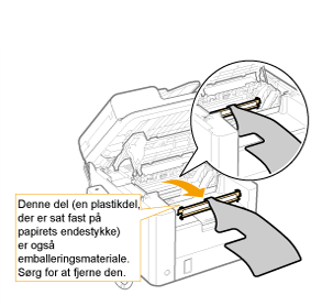 Når du fjerner det fastklemte dokument eller papir:Hvis papiret er fastklemt, skal du fjerne det fastklemte papir, så der ikke længere sidder papir inden i maskinen iht. den viste meddelelse. Sæt heller ikke hånden ind andre steder end ved de viste områder, da det kan medføre personskader eller forbrændinger.