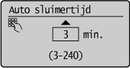 Instellingen voor automatische sluimertijd:U kunt de automatische sluimertijd instellen op een waarde tussen <3> en <240> minuten, in intervallen van één minuut. De standaardinstelling is <3> minuten.