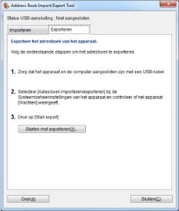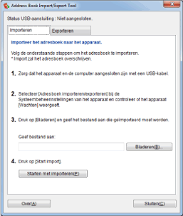 U kunt de adresboekitems die in de machine zijn geregistreerd, en de items die met de FAX L-stuurprogramma's zijn gemaakt, respectievelijk exporteren en importeren met het hulpprogramma Adresboek importeren/exporteren op de User Software CD (cd met gebruikerssoftware). Het hulpprogramma Adresboek importeren/exporteren is alleen beschikbaar via een USB-verbinding.