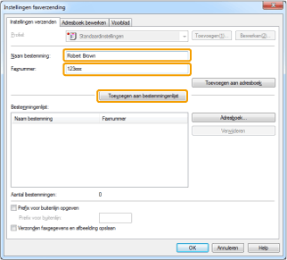 Als u [Voer faxnummer in voor u bestemming toevoegt aan [Bestemmingenlijst]] hebt geselecteerd op het tabblad [Speciaal] van het dialoogvenster [Beveiligingsinstellingen], wordt het dialoogvenster [Wachtwoord bevestigen] weergegeven wanneer u op [Toevoegen aan bestemmingenlijst] klikt. Zie de online-Help voor informatie. (Raadpleeg "De online-Help weergeven (faxen vanaf pc)".)