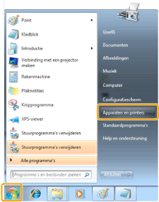 ] (Start) -> [Devices and Printers] (Apparaten en printers).