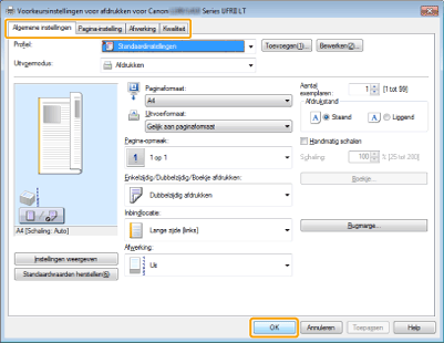 Geef de gewenste instellingen op in het scherm van het printerstuurprogramma -> klik op [OK].