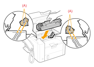 Plaats de nokken (A) aan weerszijden van de tonercartridge in de openingen aan weerszijden van het apparaat. Schuif de tonercartridge in het apparaat tot deze de achterzijde van het apparaat raakt.