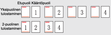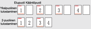Kaikki sivut tulostetaan 1-puolisessa tulostuksessa etupuolelle, jolloin parittomat sivut tulostetaan aina etupuolelle sekä 1- että 2-puolisessa tulostuksessa alla olevan kuvan mukaisesti.