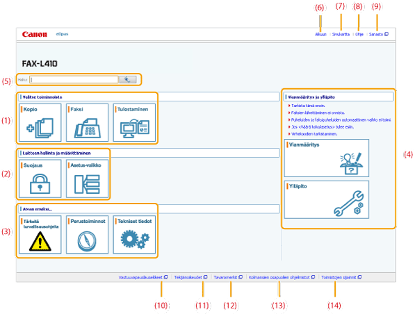 Tämä kohta toimii linkkinä valikoituun sisältöön, jossa kuvataan laitteen turvallisuusohjeet ja ominaisuudet sekä annetaan määritysohjeita ja laitteen tehokkaaseen käyttämiseen liittyviä ohjeita (kuten paperin lisääminen laitteeseen tai lepotilan käyttäminen). |