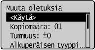 Kopioinnin oletusarvot ovat asetuksia, joita käytetään, kun laitteeseen kytketään virta, painetaan [