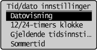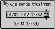 ] eller [ ] for å utheve et klokkeslettformat, og trykk deretter på [OK].Klokkeslettformatene inkluderer følgende: 12-timers (AM/PM)
