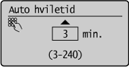 Innstillinger for automatisk hviletid:Du kan stille inn automatisk hviletid mellom <3> og <240> minutter i intervaller på ett minutt. Standardinnstillingen er <3> minutter.