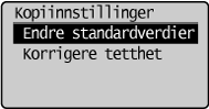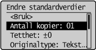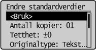 Standardverdiene for kopien er funksjonen som brukes når maskinen slås på, når du trykker på [