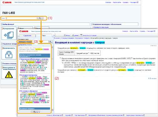 Введите ключевое слово в поле ключевого слова/текста, расположенное в верхнем правом углу начальной или тематической страницы, и нажмите [ Можно также ввести запрос в поле поиска. Чтобы выполнить поиск с использованием нескольких ключевых слов, разделяйте слова пробелом (например, при поиске «Тонер сообщение» будут выведены разделы, в которых встречаются слова «тонер» и «сообщение»). |