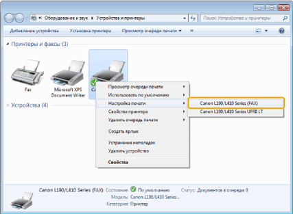 Щелкните правой кнопкой мыши значок аппарата -> выберите [Printing preferences] (Настройки печати) -> [Canon L190/L410 Series (FAX)].