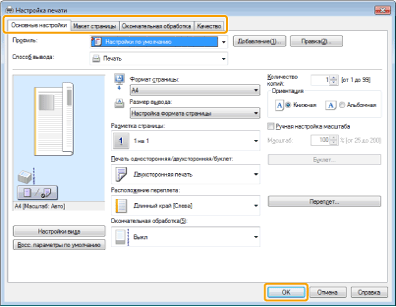 Вкладка [Basic Settings] (Основные настройки) содержит несколько основных настроек драйвера. Параметры, настраиваемые на вкладке [Basic Settings] (Основные настройки), можно указать и на других вкладках.