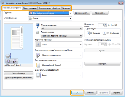 Задайте необходимые настройки на экране драйвера принтера -> щелкните [OK].