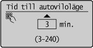 Inställningar för Tid till auto viloläge:Du kan ställa in Tid till auto viloläge mellan <3> och <240> minuter, i steg om en minut. Standardinställningen är <3> minuter.