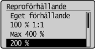Du kan förstora eller förminska dokument med standardformat för kopiering på papper med standardformat, t.ex. ändra storlek från Statement till Letter (förinställd zoom). Du kan också ange kopieringsproportioner (25 % till 400 %) i ökningar om 1 %.