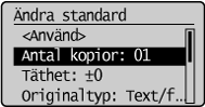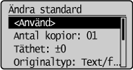 Standardvärden för kopian är den funktion som tillämpas när enheten är påslagen, när [