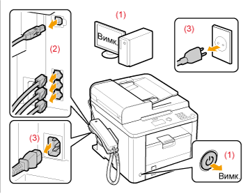 Якщо ці предмети чи речовини все ж потраплять в апарат, негайно вимкніть перемикачі живлення апарата й комп’ютера (1) та від’єднайте інтерфейсний кабель (2), якщо він був приєднаний. Потім вийміть із розетки мережі змінного струму штепсель шнура живлення (3) та зверніться до місцевого вповноваженого дилера Canon. ![]() |