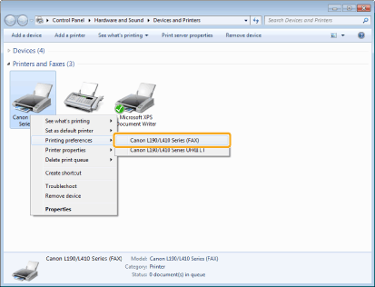 Для операційних систем, відмінних від Windows 7, клацніть правою кнопкою миші піктограму факсу, який потрібно настроїти -> клацніть [Printing preferences] (Настройки друку).
