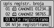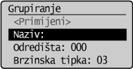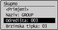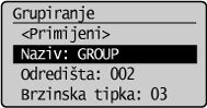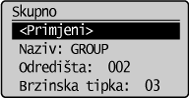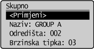 Prije registriranja grupnih adresa učinite sljedeće:Registrirajte grupu adresa na nekorištenim brzinskim tipkama ili za nekorištene kodove za kodno biranje. Nemojte iskoristiti sve brzinske tipke ili kodove za kodno biranje da biste ih mogli koristiti za grupno biranje.