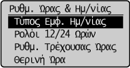 ] ή [ ] για να επισημάνετε τη μορφή ώρας και, στη συνέχεια, πατήστε [OK].Οι διαθέσιμες μορφές ώρας είναι οι εξής: 12-ωρο (ΠΜ/ΜΜ)