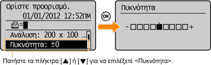 Για να σαρώσετε καθαρά κείμενα και γραμμές, ορίστε τη ρύθμιση στο κατάλληλο επίπεδο της κλίμακας <+>. Η ρύθμιση αυτή είναι καταλληλότερη για τη σάρωση κυανότυπων και αχνών εγγράφων που έχουν σχεδιαστεί με μολύβι.