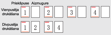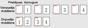 Visas lappuses tiek drukātas uz priekšpuses vienpusējā drukāšanā tā, lai nepāra lapas gan vienpusējā, gan abpusējā drukāšanā vienmēr tiktu drukātas uz priekšpuses, kā parādīts tālāk.