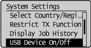 ], kad paryškintumėte <USB Device On/Off>, tada paspauskite [OK] (Gerai).