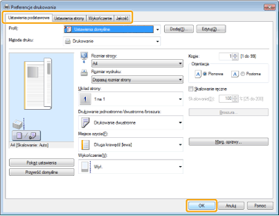 W zakładce [Ustawienia podstawowe] znajdują się podstawowe ustawienia drukarki. Ustawienia widoczne w zakładce [Ustawienia podstawowe] można skonfigurować także w innych zakładkach.