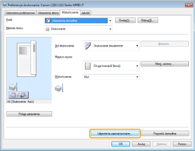 W zależności od typu papieru (szczególnie w przypadku używania cienkiego lub zwiniętego papieru) zacięcia papieru mogą zdarzać się częściej podczas drukowania dwustronnego. W takim wypadku należy wybrać wartość <Włącz>.