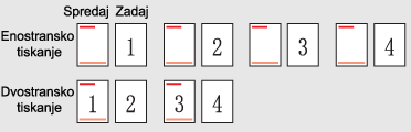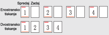 Pri enostranskem tiskanju bodo vse strani natisnjene na sprednjo stran papirja, tako da bodo pri enostranskem in dvostranskem tiskanju lihe strani vedno natisnjene na sprednjo stran, kot je prikazano spodaj.