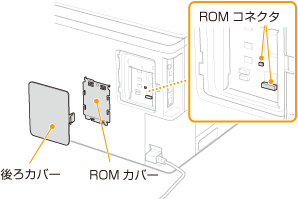 コントロールROMを本機に取り付ける方法について説明します。ROMは本体背面の後ろカバー内にあるROMコネクタに取り付けます。作業を始める前に、設置についての注意事項をお読みください。 | ![]() |