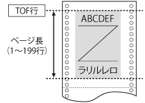 行間は 1 インチあたり 6 行(6 lpi)です(lpiは、Line Per Inchの略で、1 インチあたりの行数を表す単位です)。 設定値が 1 増えると、ページ長が約 4.2 mm(1/6 インチ)増えます。 操作パネルまたはコントロールコマンドによってミシン目スキップ行数が設定されている場合、実際の改ページ位置は、設定したページ長の位置より上になります。 |
